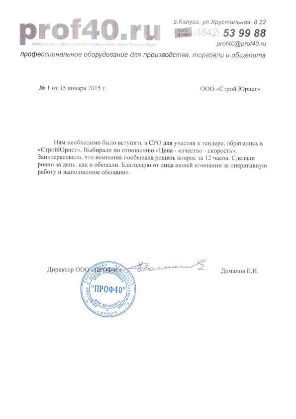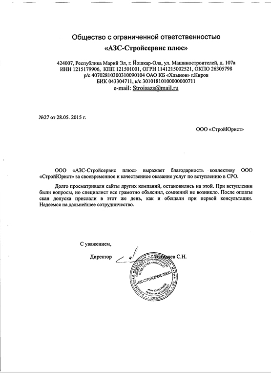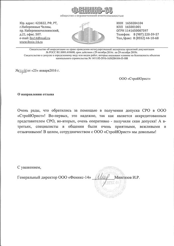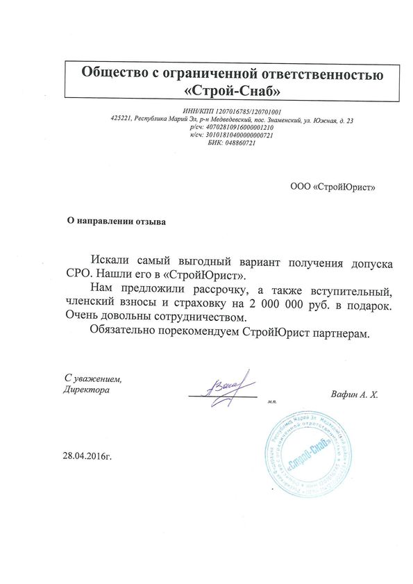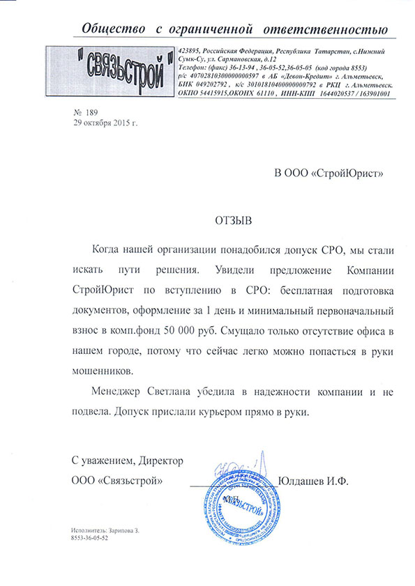 Отзывы клиентов "СтройЮрист" по вступлению в СРО в Салавате
